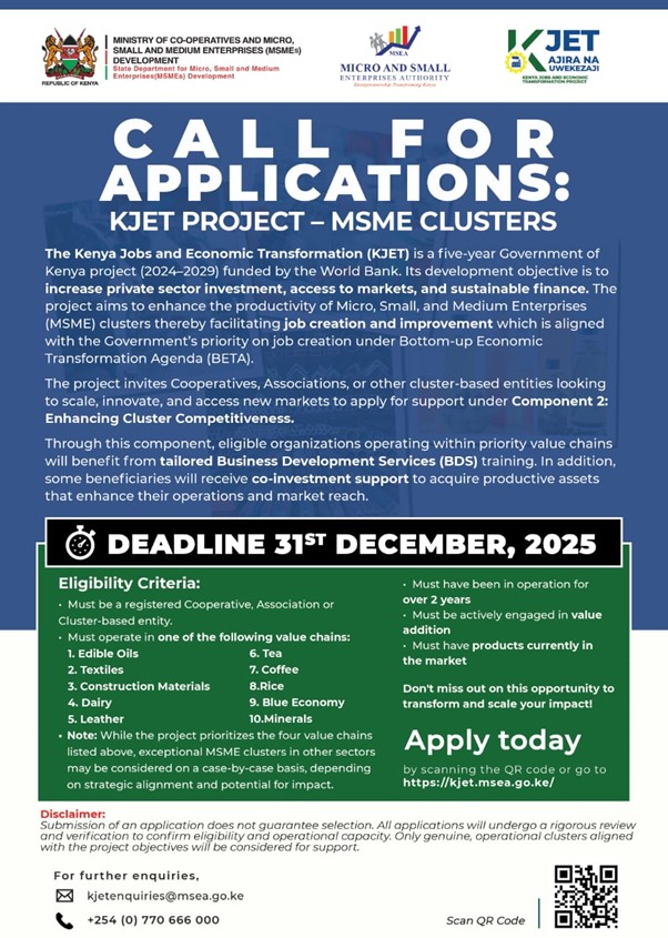 MSEA continues to invite eligible cooperatives, associations, and cluster-based MSMEs to apply for Cohort 2 of the BDS Training, which remains open until 31st December 2025. Interested clusters are encouraged to apply early through the KJET Portal at https://kjet.msea.go.ke to benefit from this transformative project designed to enhance cluster competitiveness, improve business outcomes, and drive inclusive job creation across Kenya.